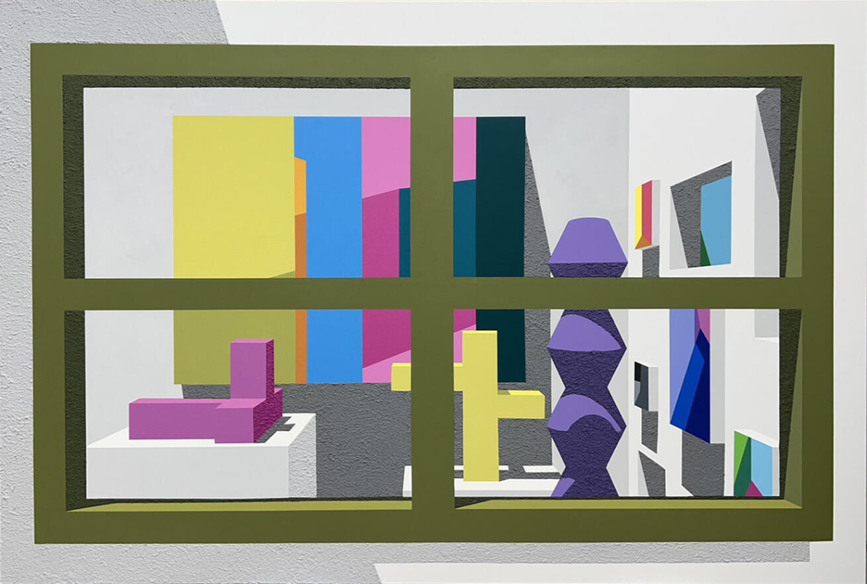 Harada’s experiment presented in this exhibition goes further by combining a pictorial space with the real space of the venue. Space as a painting motif is reconfigured physically, so that the exhibition room comes to be something seen through a window. The installation layers inside and out in multiple dimensions. It encourages us to move visually between them. The virtual space that Harada took as her painting motif, is now turned into an Albertian window. What the viewer encounters is a transposition of 3D CG into 2D representation. Harada builds 3D qualities pertaining to virtual space within our actual, physical space. She focuses on the illusory effect caused by these alternating dimensions. In the presence of virtual worlds made real, we find ourselves overcome by fantastical and confusing realms. 3D installations look like 2D tableaux.
