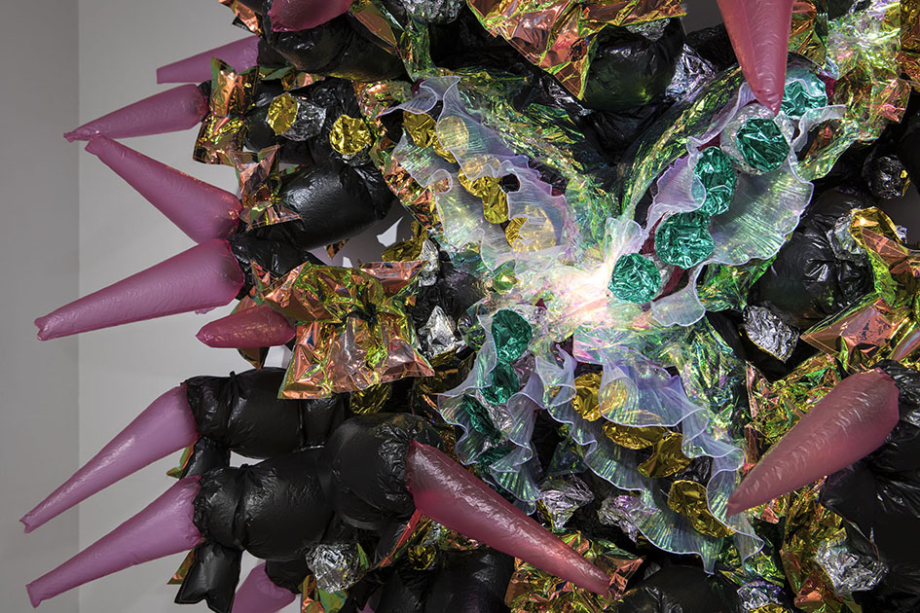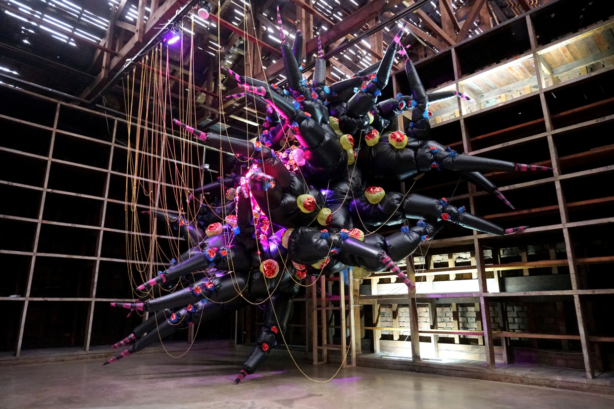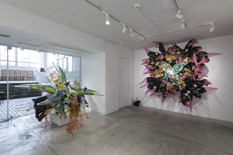 Inside the gallery, several concave mirrors are installed on the walls, with a object shaped like a living creature placed before them. This object, which moves ever so slightly as if breathing, reflects distorted, transformed versions of themselves within the mirrors. Surrounding lights accentuate the undulating contours of the warped forms, producing a unique visual effect.