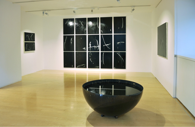 In one thing she has been consistent. This is her method of scratching at her material with a ballpoint pen. It is as if she is searching for something invisible or, in scarring the heavy black plane of the oil painting, that she is leaving traces of her body. She is no longer a person who is satisfied with only two dimensions.