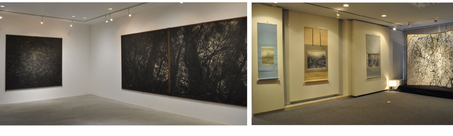 Gyokuju Funada’s landscapes create unique atmospheres. The temple drawn in Rain of Kuhombutsu reveals the artist's internal enlightenment. His later screen paintings, whether representing forests of plum or cherry, or snow scenes, reflect the gorgeous artifact of his thought running through his brain like a storm.