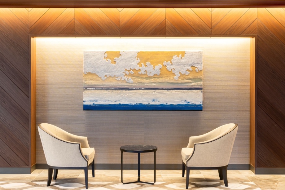 In the grand entrance, suspended ceiling pieces blend with light to create a transcendent atmosphere. Positioned in the east and west towers, the artworks in lounges and guest rooms embody 'grace' and 'refinement,' adding beauty and character to spaces of diverse, captivating styles. Our art installations reflect the interior concept of 'timeless elegance, a legacy to be celebrated worldwide.'