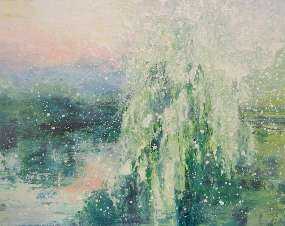 アートフロントギャラリーでの個展は約4年ぶりとなる北城。タイトルの「white out」には、「光に包まれて見えなくなる」、「感覚で感じる色や形に撃ち抜かれる」という意味合いを込めました。一貫して「光」を描いていると語る北城は、下地材の加工から仕上げ材の光沢まで、様々な画材をとても丁寧に研究し作品を構成しています。その作品群は、絵画の画面構成もさることながら「絵具」という物質の存在が、表層よりもこちら側へ「光」が迫って感じられるよう力強く作用しているように感じられます。本展では、水面をモチーフに描いた新作の「white out」シリーズとあわせて、草木や花と共に光を描いた作品シリーズも発表予定です。北城の描く「光」をぜひ会場にてご体感ください。