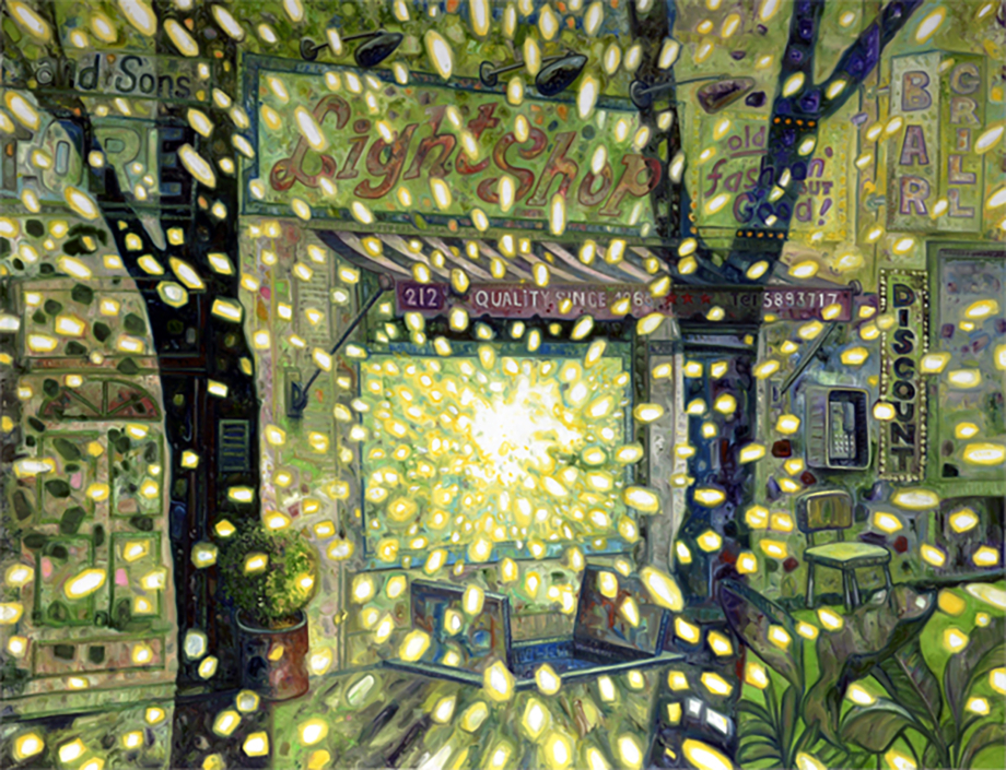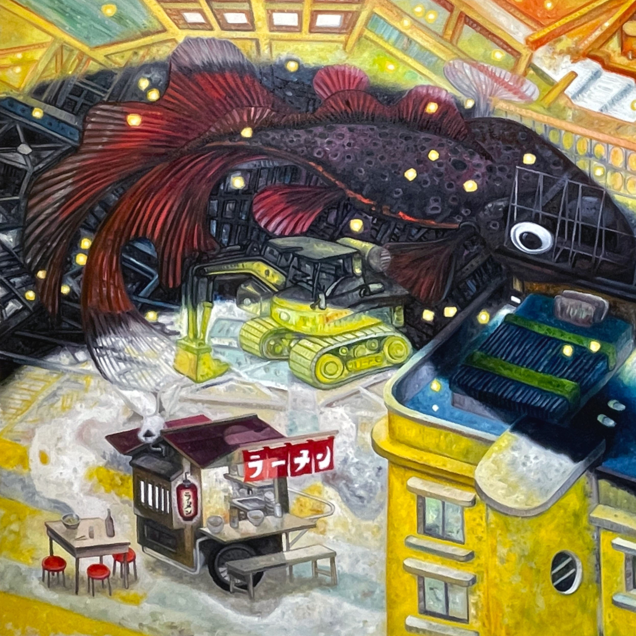 みどころ 作家によれば、様々な作品に何回も出てきているラーメン屋台は「昭和」のモチーフ、白い透明な花か雲かわからないモチーフは、アメリカに来て描き始めた「Light Flowers」このほかにもホテルシリーズや、ツリーハウスシリーズがあったり、いろんなものが混ざって自分の世界が出来ていく――いろんなボキャブラリーを使って世界を構築していくという感じです。自分の古い絵をみるとその時の試行錯誤を思い出します。当時いろいろ考えてテクニックを編み出しました。その軌跡が今回新たな作品になっています。