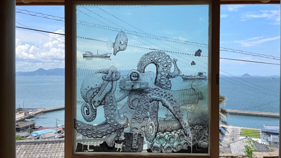 最近の活動から オスカールは瀬戸内国際芸術祭の初回2010年以来男木島で制作活動を行い、壁画やだまし絵風のインスタレーションを発表してきました。昨夏見晴らしのよい男木島の高台に、紙管の構造で知られる建築家・坂茂が家屋を建てそのガラス窓と襖に作品を展開。遠くの瀬戸内海を往来する船の姿を借景として、巨大なタコをはじめとする海の生物たちを描きました。男木島パビリオン 瀬戸内国際芸術祭2022 巨大なタコのモチーフは2016年のアートフロントでの個展に出品された《Giant Octopus 2》にも描かれています。(2019年金沢21世紀美術館での個展《光をめざす旅》にも出品)鮮やかな油彩だけでなく、部分的に洋金箔を使って水面のきらめきを表現しています。今回、この作品は今年5月のTaipei Dangdai に出品予定です。