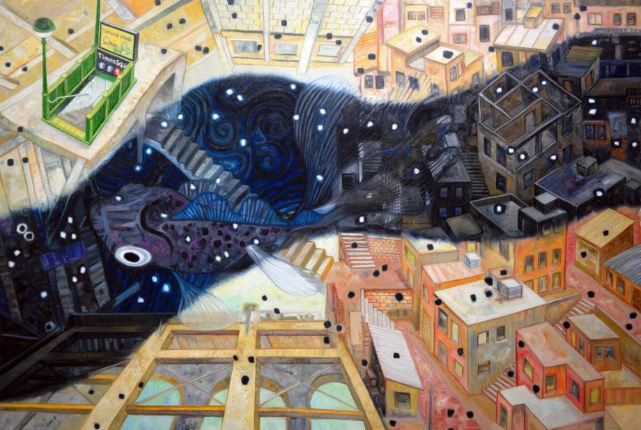 今回の一連の新作は、異なる時期に異なる場所を描いたこれまでの自作から場面を抜き出し、組み合わせ、改め新たな絵画に再構成した。時間軸と空間がつぎはぎされた自作絵画のコラージュは、そのまん中に曲がりくねった漆黒の川が縦断する。ある時間から別の時間へ、こちらの場所から向こうへ。最寄りの地下鉄の入口が開いていると思えば、もうお目にかかれない懐かしいラーメン屋台がたたずむ。《Bathtub Man》(2008年)から引用した湯に浸かるロボットは、人工知能も湯煙を愉しむユーモア混じりの情緒でもあり、描かれた時には存在していなかったはずの汚染水タンクと燃料棒を納めたプールを想起させる。そう、《戦争と平和》で時代を遡り描かれた戦禍の煙が、その後別の街を襲った津波の有様を予見していたように。