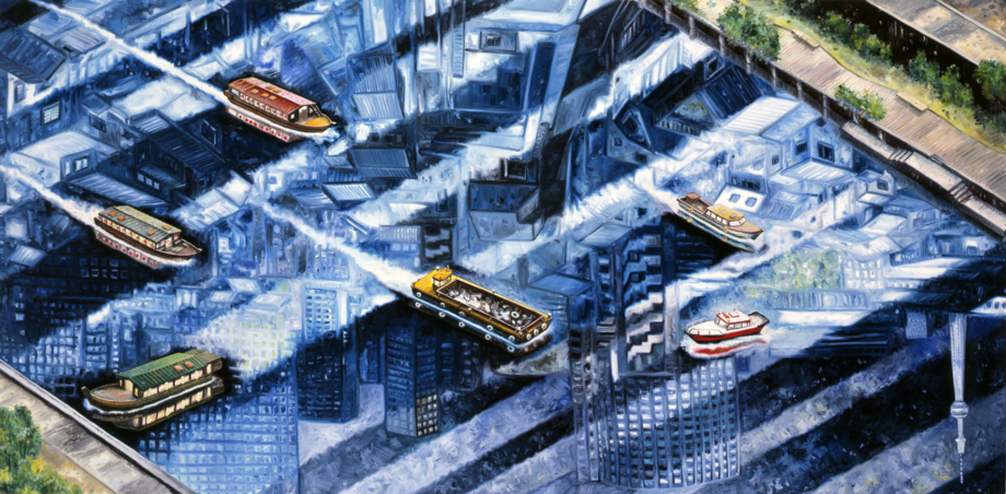 ブラジルに生まれ、サンパウロ大学で建築を勉強したあと1990年代は東京で建築とアートと両方の道を目指しながら働いていたオスカール。ニューヨークに拠点を移したあとも、様々なプロジェクトに参加しながら日本―アメリカーブラジルを旅しながら制作を続けています。いわば旅するアーティストです。そんな作家にとって、川は海につながり、世界につながっているという点でいくつかの川を描いてきました。第二室では《Sumida River》(墨田川)が展示されます。《Sumida River》2015 キャンバスに油彩 111x227cm 戦後1950年代にブラジルに移住した自分の父親の影響もあり、船をよく描いているというオスカール。2019年の上海都市芸術季(SUSAS)では上海都市の歴史を鑑み、ガラスでできた船に植物を載せたものが緑の波の上を進んでいくという大がかりなパブリックアートを発表しました。建築・都市計画など幅広い分野とまたがるような大規模なアートを手掛け、注目を浴びています。