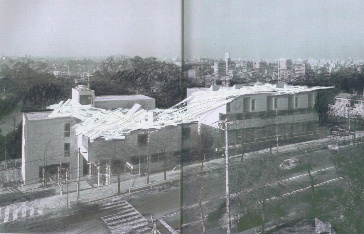 今回、川俣が出してきたプランは、ヒルサイドテラスの屋上を木材でおおうというもの。これまで壁、通路、天井、小屋などさまざまなかたちに木材を組み上げてきたが、屋上を使うのはあまり聞いたことがない。なぜ屋上かといえば、ヒルサイドテラスの横の歩道橋が近隣住人の要望により撤去されることになったことと無縁ではないだろう。彼は歩道橋の上から見られるインスタレーションを築くことで、歩道橋に最後の「見せ場」を与えたのだ。これなら歩道橋がなくなっても、川俣作品を見た場所として記憶に残るはず。いわば歩道橋のリベンジ?