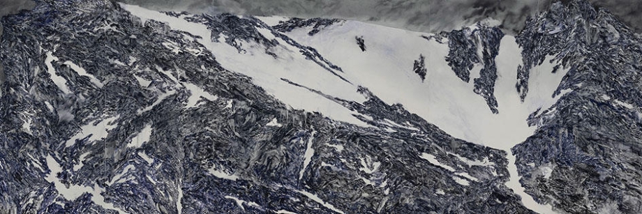 春原にとって、作品のモチーフとしての山との出会いは、住む場所の変化による発見であった。気候や地形の違いから、馴染みのある対象が新たな視点で捉え直されたことは、環境と人間の情緒的なつながりの観点からも興味深い。故郷の峨々たる山の記憶と新たな土地で出会う山々のたおやかさ。当初移住者として向けた山への眼差しは、その場所で制作を続けるなかで、より複雑な態度として現れてくる。春原が現在拠点をおく山形は山岳信仰の地である。作品のモチーフである飯豊山(《蒼連》2018)や龍山(《龍現》2017)も、古くから崇拝の対象となってきた山々だ。しかし、春原にとっての山は古来の畏怖や嫌悪感を伴う宗教的イメージでも、ターナーやフリードリヒが捉えたような崇高さや壮麗さの象徴でもない。作品において、山は目指すべき垂直的な頂としては表されず、また、近景を引き立たせる彼方の存在としても描かれていない。春原は、自らをその只中にとどめ、 パノラミックな視点でその動きを展開するのである。肉体的かつ精神的な到着点としての頂を仰ぎ見るのではなく、とどまることもたどり着くこともなく彷徨いながら心身と山とが交わっていく。そのように捉えられた山は、身体による知覚を可能にする、行為と絵画平面とを密接に結びつけるための対象なのではないか。