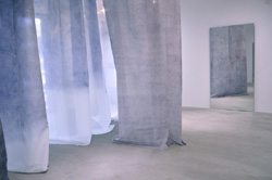 東京都現代美術館では大きなインスタレーションを展開しており、作品は明らかに作品の外にある空間や人に関わり始めている。これまでは作家の内面の声や行為の形跡を通して身体が感じ取られる作品であったのに対して他者に対して次第に開かれてきているようだ。それでも他者を許容するのでなく、これまでは作家だけであったのが見る側をも深い霧のなかに誘い込んでいるようにも思われる。そこでは声だけが聞こえ、見えない誰かを探して私達は深い霧の中を歩かなければならない。私達が目を見開いて作品に対峙しても向こう側に「何か」がありそうなのに、輪郭さえ見えてこない。