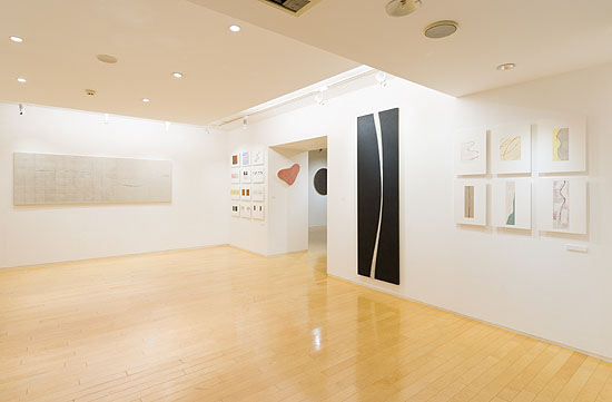 「庭」「流れ」「松」など具体的なイメージの作品から、近年は「□△○」など支持体が幾何学形になったり、「線」「塵」のシリーズでは一本の抽象化された線で自然観宇宙観を表現しています。