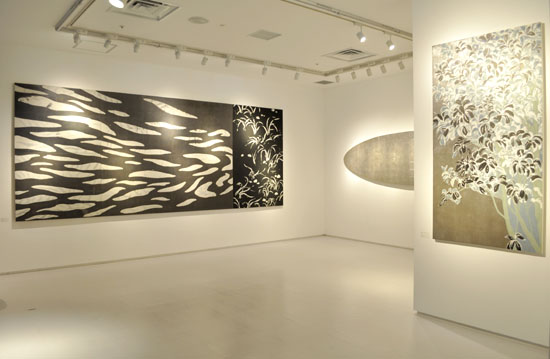 いずれの作品も銀箔や金箔、玉虫箔などが使用されており、箔の持つ雅で華やかな輝きを活かしつつも、作風はこのうえなくシンプルでモダンです。そこには本当に必要なもののみを選び取る丁寧さと潔さを感じ取ることができます。