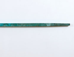 今、作家として、また1人の人間として、ひとつの区切りに立っていると畠山は自覚する。そのただ中で彼が作り出した今回の展示の核となる作品《青と緑の間》は、今後の畠山の表現の可能性をさらに押し広げるものである。約2メートルの長さを持つ角棒状の青銅作品は、中央に僅かにふくらみを持たせて両端がすぼみ、微妙な反りを浮かべながら、我々の目線の高さの壁に在る。かつての刀匠が持てる技術と精神、美意識を結晶化させた槍や刀、そしてそれがある空間をイメージした、と畠山は筆者に語った。壁を一文字に切り裂き、別の時空を出現させたかのように不思議な緊張感に満ちた青緑のラインは、一振りの太刀風のように眼前の空気を揺らし、見る者の身体を揺さぶるであろう。