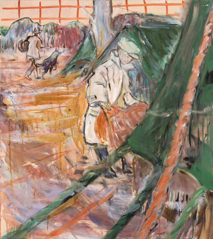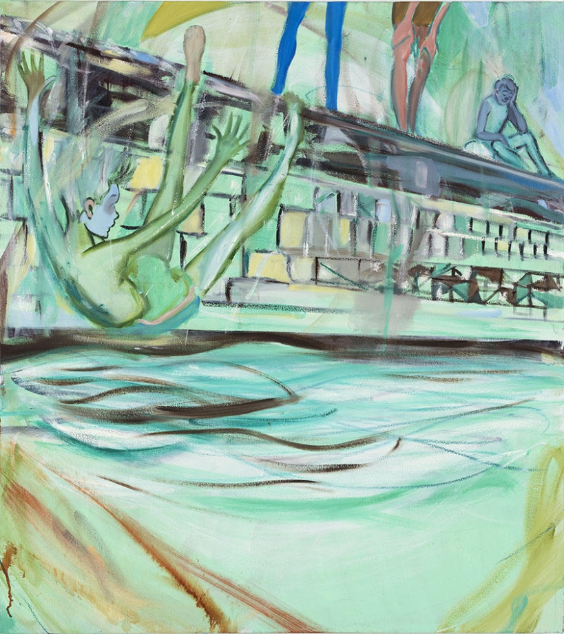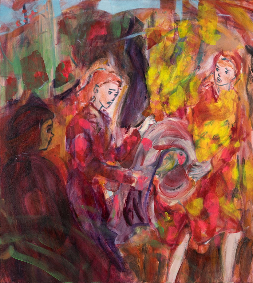 これらの一見明確ながら挙動の定まらない導き手から、私たちの視線はその周囲へ、画面全体へとさ迷うように導かれる。好奇心が欲すままに人物の周囲に眼を向ければ、画面の上を横切るのは生き生きとした筆致で描かれた具象とも抽象ともつかない線と塗りである。それらは、ときに不穏に揺れる波動や夜光雲、目の回るような喧騒、あるいは遠くの稜線などをかたどるが、整った輪郭線とはほど遠く、緩急自在に画面を動き回っている。「何かを観察する(toy with)ということは対象を操作することであり、複数の文脈において試行してみることだが、いずれも決定的ではない。」2 作家によるストーリーテリングを期待する視線は、それ自体が生き物のように流れる線が躍動する画面へと放り出される。そのストロークの大胆さの根源には、構造や視覚言語の技巧性による認識論的な絵画表現より、作家自身にも思いもよらないようなものが生まれる瞬間を視る悦びへの指向があるように思われる。双幅の絵画においては、隣り合う画面間の「間」が物語を宙づりにする。しかし、この「間」に想像のための無限の空間を見出すというのは、いささか日本的すぎるだろうか。