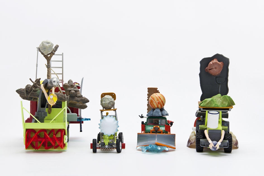 現代の高度消費社会で大量に生産されるフィギュアやおもちゃ、日用品などを収集し、それらのパーツを分解し、その物質が本来持つ用途や意味を一度消失させます。その上で、それらを組み合わせ、再構成させるコラージュ的手法で、作品を作り上げています。