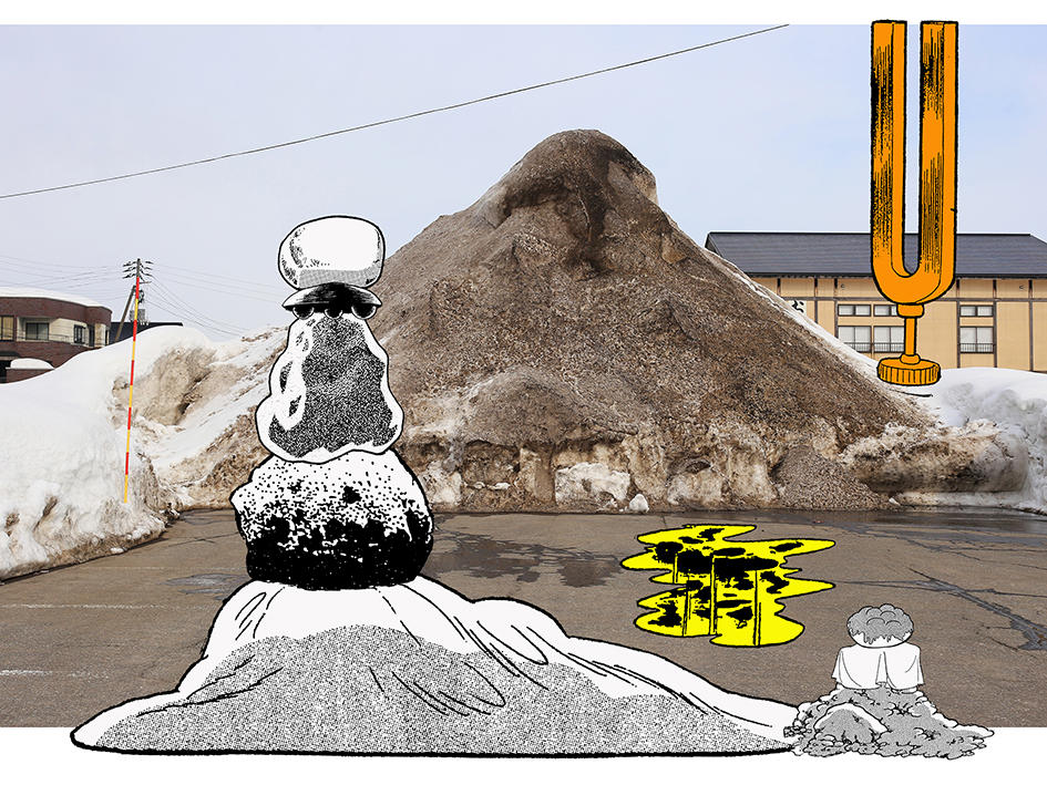 それゆえ、圧倒的な機動力で雪をかき散らし、道を切り拓くのであろう大型除雪車の造形には、一方で、どこか無敵の英雄ロボットや秘密兵器のごときイメージが重なる。あらためて冬にも現地を再訪した金氏は、実際に稼働する除雪車の勇姿に痺れるとともに、そこここに築かれた人工的な雪山/雪捨て場の姿に、SFじみた非現実感を抱いたという。