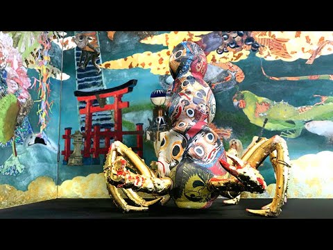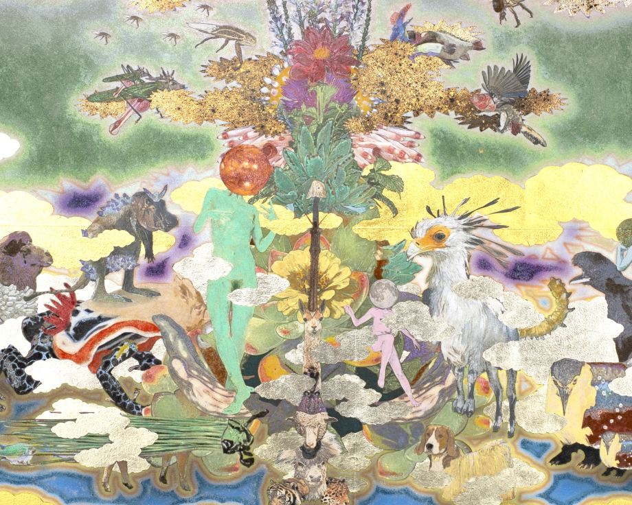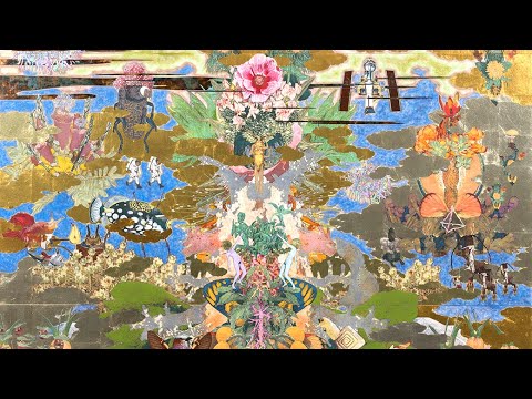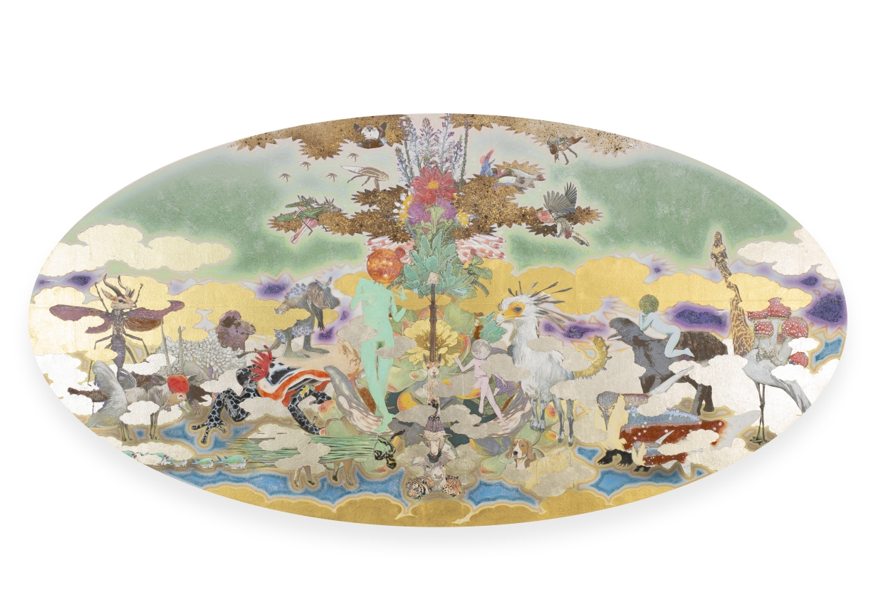 1999年頃にはじまった鴻崎正武の代表的なシリーズである「TOUGEN」にも無数のキメラが描かれており、作品の重要な要素として捉えることができる。南蛮屏風や洛中洛外図を連想させる様式を土台として、頭部が鳥の裸婦をはじめ、人工衛星や伝統民芸品などの人工物と動物や昆虫、花などの動植物が混合したキメラなど、そのバリエーションは膨大だ。そんな鴻崎のキメラと冒頭のラボ由来のキメラが、どこか重なっているように思えてならない。