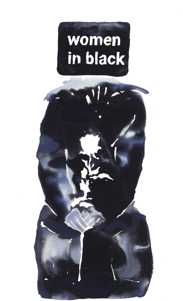 「Breaking History」は二つの独立した水彩画のシリーズで構成されています。最初のシリーズは、「Women in Black」と題されています。喪に服しているかのように黒い服に身を包み、白い花を手にした女性たちによる静かな抗議活動に捧げられたものです。ウクライナへの侵攻に反対するこれらの抗議活動は、ロシアのさまざまな都市で行われました。参加者のほとんどは女性でした。もともと、女性による反戦活動がとても盛んだからです。デモ参加者は拘束されることもあれば、されないこともありました。この抗議活動の形態は、第一次インティファーダ(訳注)の時、イスラエル兵の暴挙に対するイスラエルの左派の女性活動家たちによる抗議活動に由来します。その後、世界各地のフェミニスト団体によって、自国政府の行動を批判するために取り入れられるようになりました。これらの作品で使用した最近のロシアの抗議活動の写真では、当局が活動家を特定できないように、頭部が切り取られていることが多々あります。ロシアでは今の状況を議論する際に「戦争」という言葉を使うことが禁止されているため、デモ参加者はこの言葉をアスタリスクや他のスローガンで隠すなどして、平和を訴えます。それでも、デモ参加者が当局の迫害を完全に免れることはできません。私はこれらの作品の中で、こうした代わりとなるスローガンを使うこともあります。