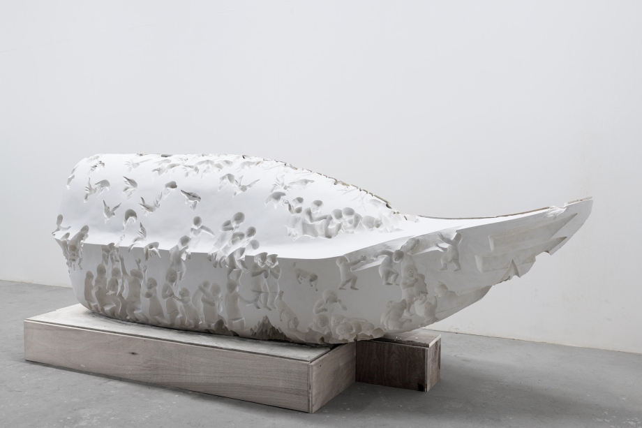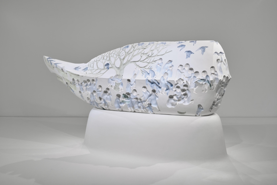 そんな中、本展のための新作《デコボコの舟》(2022)と《すくう、すくう、すくう》(2021)は、こうした試みを集わせつつ、これからの展望が窺える転換点たるものではないでしょうか。前者は2014-15年ごろに試みられた、人や舟のかたちに沿って像を配したシリーズを雌型によって反転した作品で、樹脂は流されず、凹んだ像に着彩のみが施されています――つまり、以前はさまざまな実像がつながり母体となる舟の輪郭線を浮かび上がらせていましたが、本作ではあらゆる虚像が一艘の舟にまるで巣篭もりし、その輪郭をむしろ霞ませんと覆い尽くしています。また、舟が漆喰から少し立ち上がった姿は、静かな水面へ押し寄せた一つの波によって重力からひととき解放されたような佇まいです。