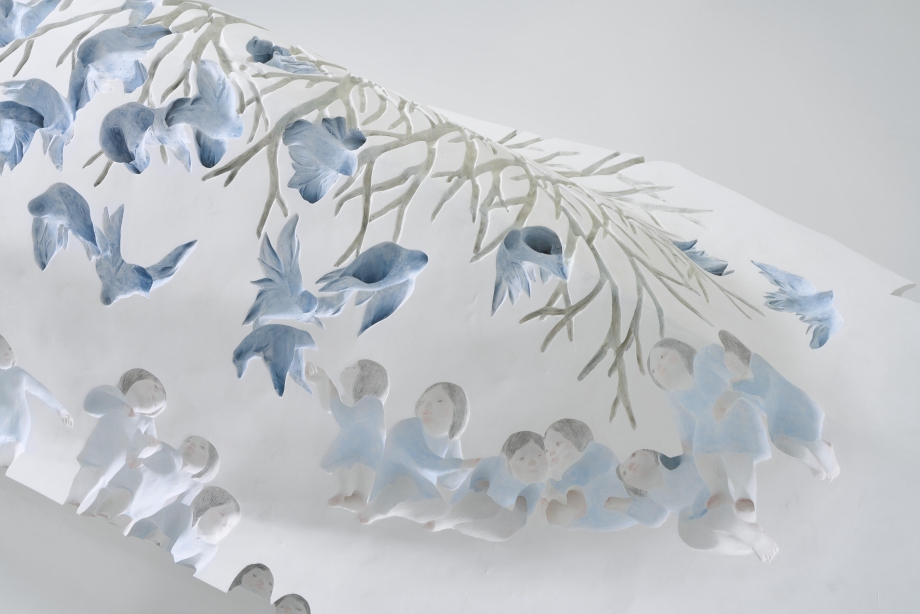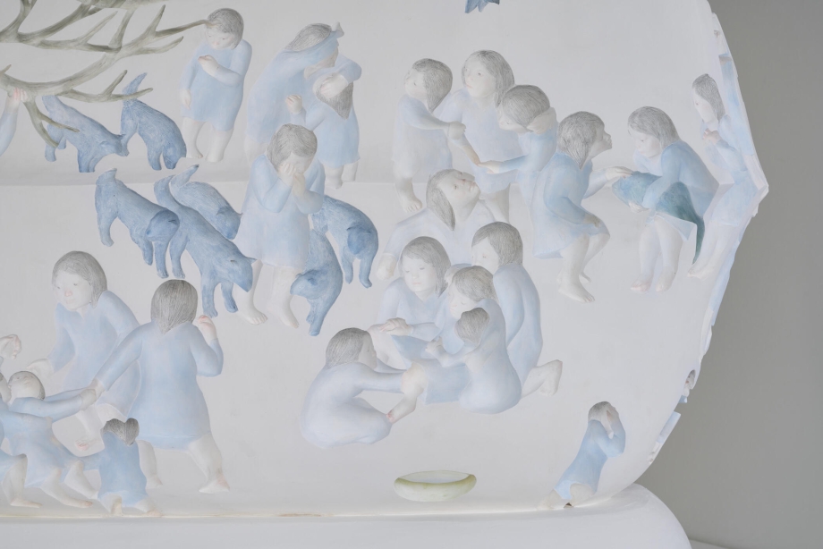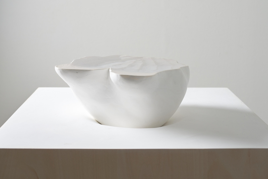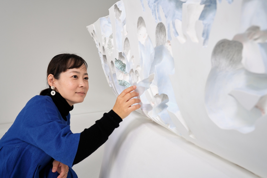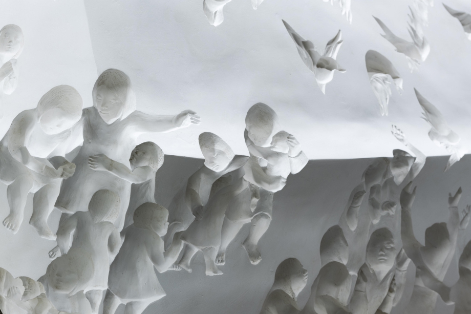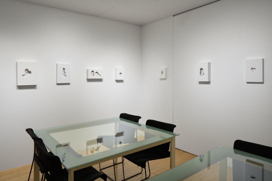 この作家の代表的な作風として、粘土で象った浅浮彫(レリーフ)の像を石膏で抜いて着彩し、そこに樹脂を流し込んだ手法があります。石膏と樹脂が均(なら)された矩形(くけい)の姿は絵画に似ながら、その像は彫刻そのままにこちらの視線の移ろいとともに向きを変え、ものの存在/不在とそのあわいを詩的に示しています。近年では、樹脂に置き換えられた像のみが石膏を皮膚のごとく纏(まと)ったもの、樹脂を流し込まず像を石膏上に凹面のままとしたもの、樹脂に色をつけ夜の帷(とばり)が下りたとも思しき光景を表したものなど、いっそう豊かな展開を見せてきました。