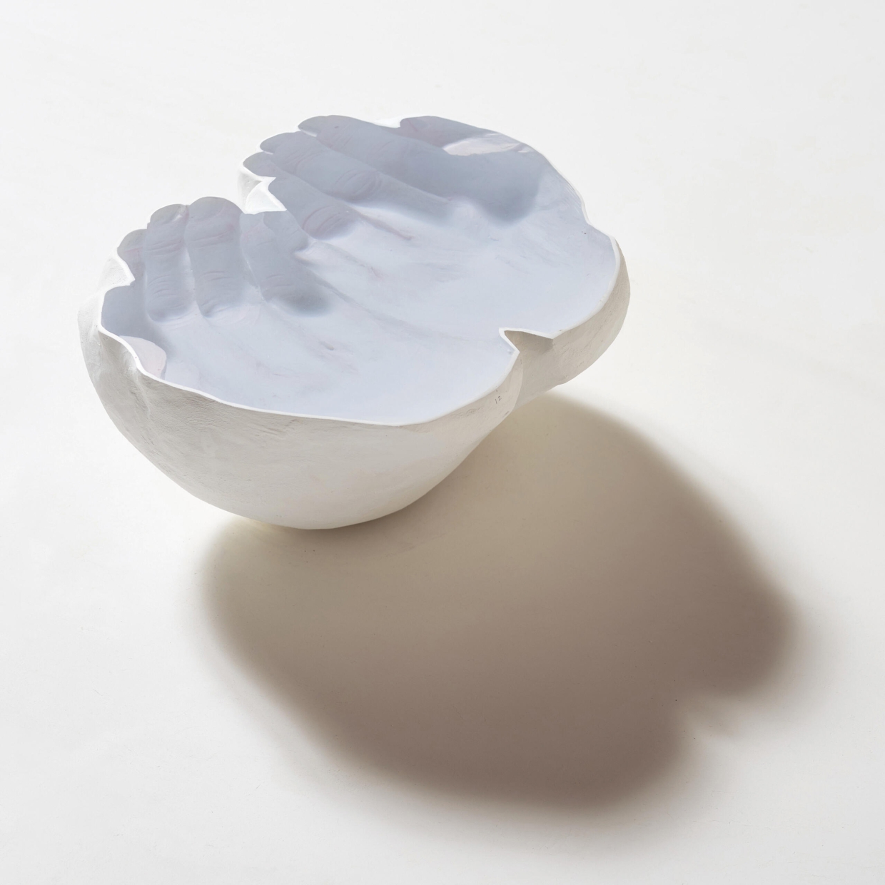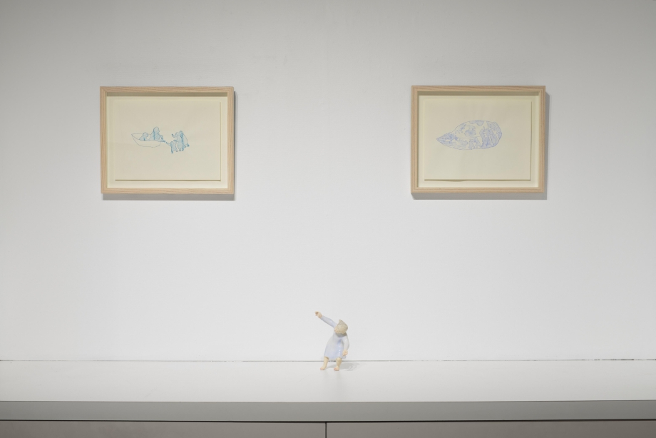 はからずも対となるような二作品ですが、つまるところこの彫刻家はこうした振れ幅をもって、量塊としてのものとそれが立つ場とから彫刻が存在しうることを表そうとしているのではないでしょうか。実体であるはずの舟は夥(おびた)しい数の虚像で消されつつあり、また手そのものは存在しないにもかかわらず水を掬(すく)おうとしている。それでもなお彫刻であり続けることを渇求するかのように着色や樹脂がほどこされ、彫刻の気配をかろうじて帯びている。地面から立ち上がる舟は反語的に、そして沈み込む手はそのままに、実体が失われたはずの彫刻、その量塊を仄めかす――どんな量塊も、その表面でしか見られないにもかかわらず。つまりこの彫刻家は、素材や支持体そして付属物(パレルゴン)をも所与のものとせず、彫刻が消え入るその刹那でもなお如何に存在しうるのかを、その手で探り続けているのでしょう。