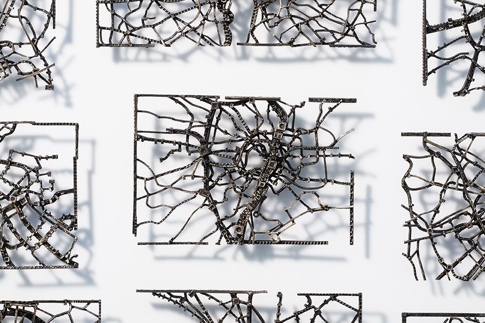 東京で生まれ育った久野にとって、都市の風景が上書きされることは日常的にありふれたことであった。雑然とした街の空気感に惹かれた久野の関心は、やがて地図上の境界線に向けられた。久野は、グーグル・アースによって俯瞰して見ることができる地球上の都市に着目した。鉄道や高速道路、高層ビルなどの人造物の輪郭を、精密な鋳造技法で造られた金属の線として掴み取る。それらのパーツを組み合わせながらヒューマンスケールを超える世界を表現する。一望高みから現実を表した久野の作品からは、日々の生活の中では見えない心象風景が感じられる。目の前のものに気をとられると本質を見失ってしまう。景観の変化に対して必ずしも悲観する必要はなく、それに反して、人の営みによって世界はどんどん良くなっていくという久野の意志の表れが作品から感じられる。