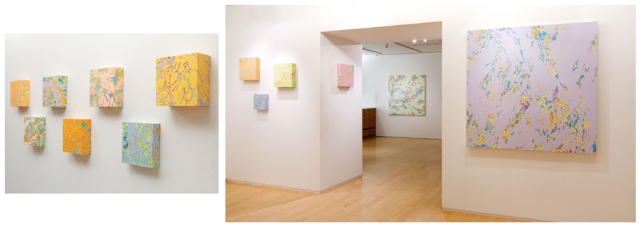 支持体に木製パネルを用い、その上に8層から多いもので10数層の絵の具を塗り重ね、一線・一片を削り取って制作される作品群は、鋭利な痕跡を残す一方、有機体であるかのような柔軟さをもっています。