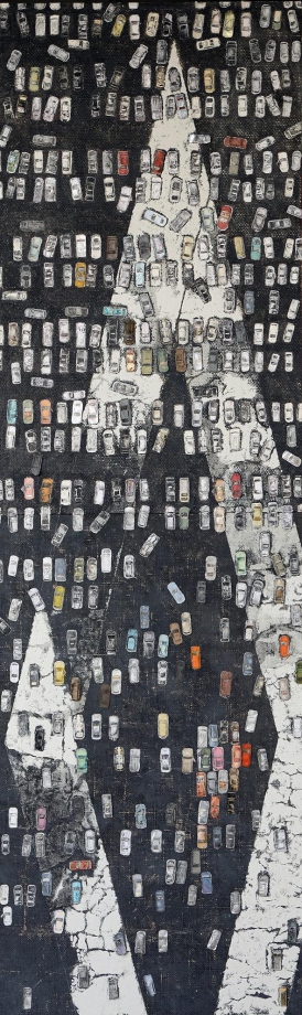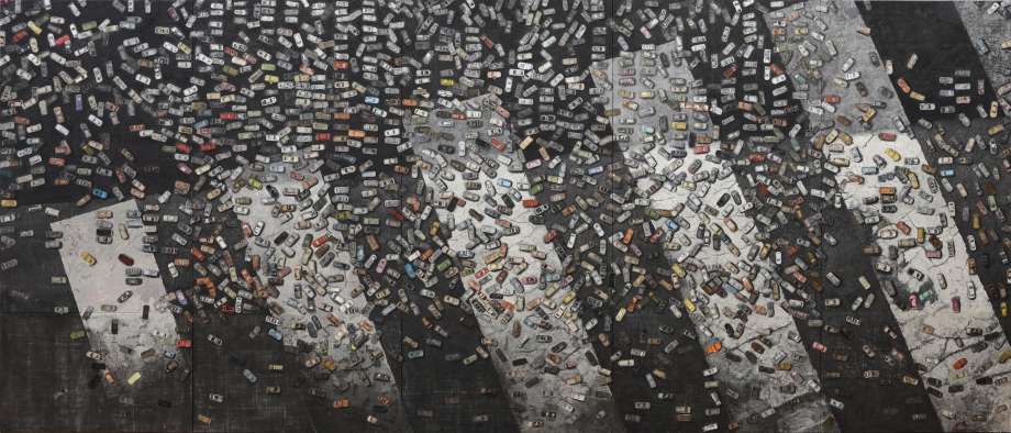 そんな元田が、新たな展開として「CARS」と題した連作に取り組んでいる。素材感のある実物大の道路上に、主にリトグラフによるコラージュという硬質な手法でびっしりと表されるミニカーの車たちは、くたびれ古び、カタカタと音をたてそうだ。反復・相似するようでいて少しずつ個性が違う姿は愛らしくもあり、石畳上や砂の中で身を寄せ合うものもいる。戦火から逃げ惑う姿か、商業主義に促された通勤や余暇のラッシュに身を投じた末か。様々な想像が重なるのは、恐らく見つめる私たちの「リアル」が知らず知らずに絡めとられていくからだ。元田の緻密な手から生まれた小さな車たちは、どことも知らぬ地を目指す。私たちは、やがて自身が乗っている一台さえ、その絵の中に発見できるのかも知れない。