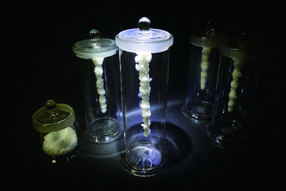 Room-Bでは、本年(2019年)参加する瀬戸内国際芸術祭で発表する作品に、彼の考える場所性を加味した作品である。瀬戸内海に面する彼の生まれ故郷、香川県坂出市。かつて塩の生産が盛んであったこの地の歴史を捉え、瓶の中で氷柱状に吊るされた塩の結晶がゆっくりと溶け出して行くことで、南条は坂出に纏わる、近く遠い時間と場所の記憶を呼び戻すことを試みる。