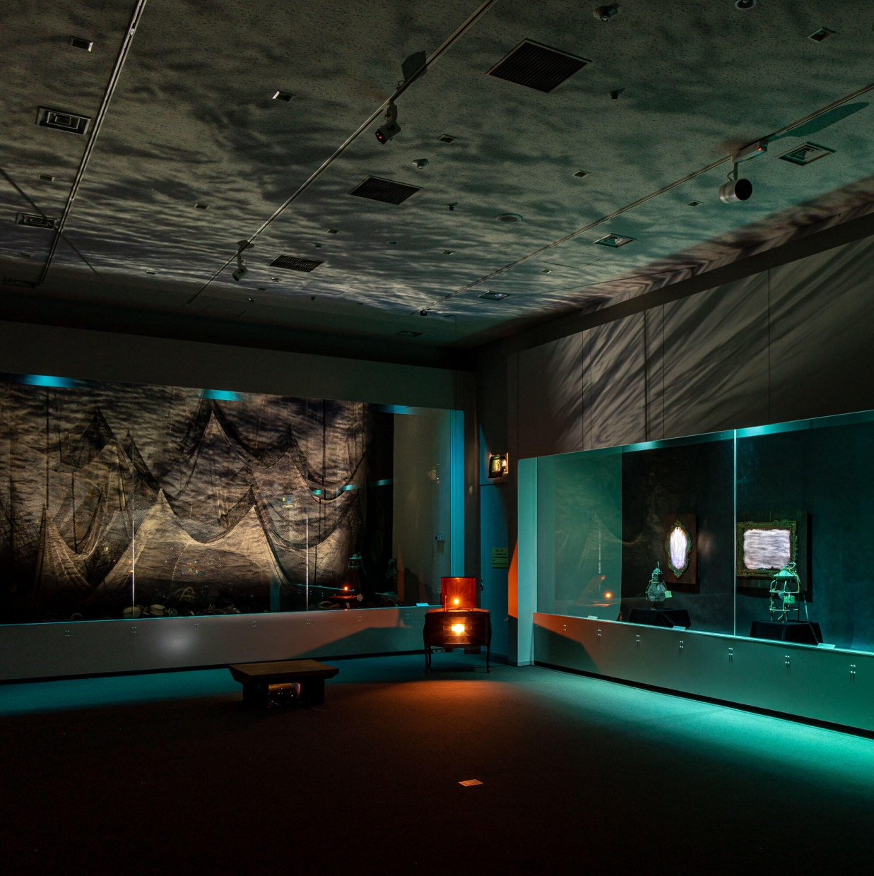 とはいえ水はすべてを包含する表面であり、その干満の中で、太古の地層となり、初期人類や洞窟壁画の地層ともなり、波と浮力の動きの中で他の表面と対話する。ここではすべてが表層で起こっているが、パリンプセストのように、表層は透明なものとして扱われ、その下に織り込まれた層を垣間見せる。このようにして、南条は場の時間層を重ね合わせることで、その場所の本質や魂を明らかにする。表層を投影することによって、陶器、石、日常的な道具などのオブジェが媒介となり、時間の層の深みへと私たちを引き込み、或る表層から別の表層へと私たちを導くのである。影、照明、投影は、新たなイメージを位置づけ、空間を回析するような一連の装置を構成する。