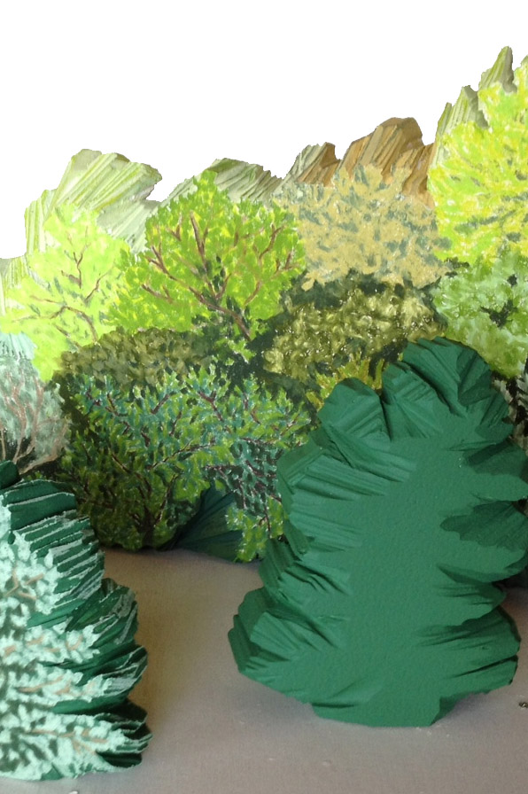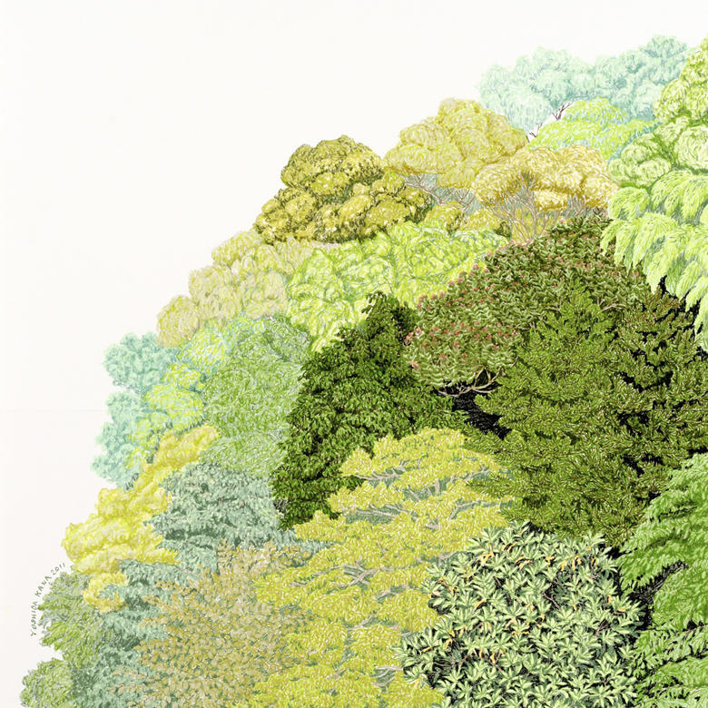 東京での個展としては1年振りとなる今回のアートフロントギャラリーの展覧会ではこれまでのパネルに描かれた作品だけではなく、パネルから脱してギザギザと輪郭を切り落としたレリーフ状の新作の森が並ぶ。輪郭はこの作家の絵画における線と同様、素描のような勢いのあるもので、作家のこれまでの製作の延長にある仕事だと納得できる。森はそもそも視覚的にその形状を全体として捉えることが出来ない。木々の中を進むと風景も変わる。そこには大きな木が倒れていたり、視界が急に開けたり、様々な風景が次々と展開してゆく総体が森と呼ばれるものであるはずだ。一本の木が独立しながら、かつ全体で森としても捉えられるように、吉田の作品も一つ一つの作品の形状が面白いだけでなく、設営しながら組合せを考えるであろうが、大きな森のようなインスタレーションになるのと思われる。私たち森の中を歩くよう様々な風景を見ながら、作家の介在によって広がるアートの領域、可能性がまだまだあったことを再認識できると思う。