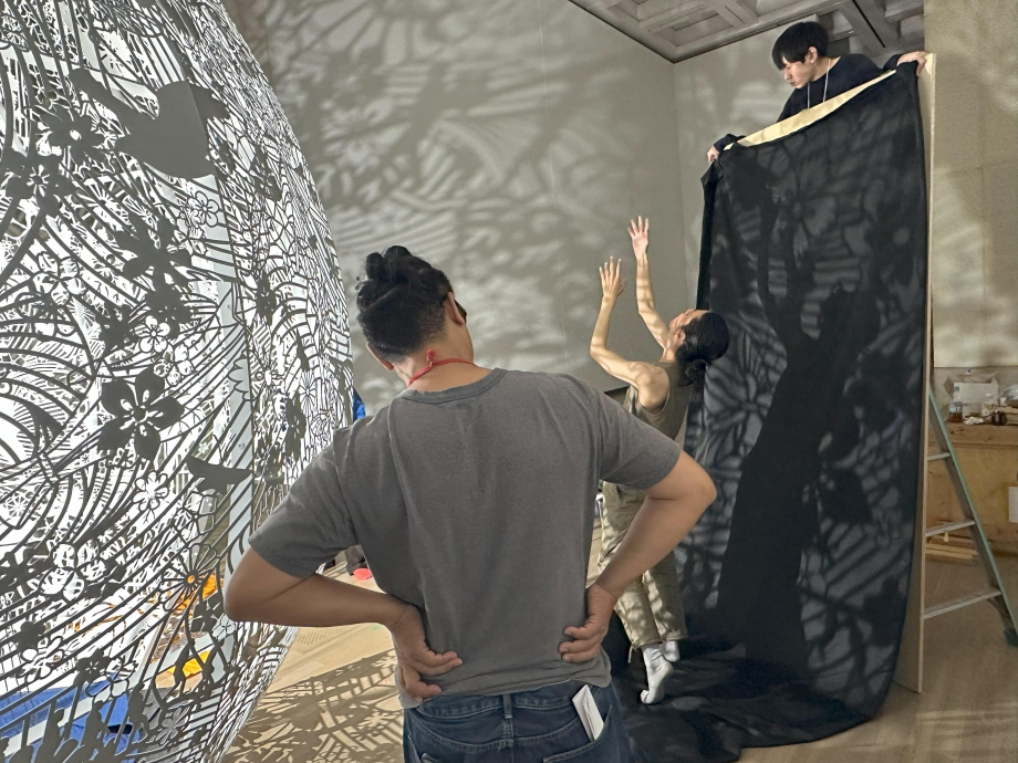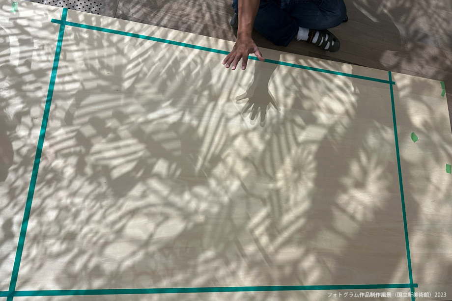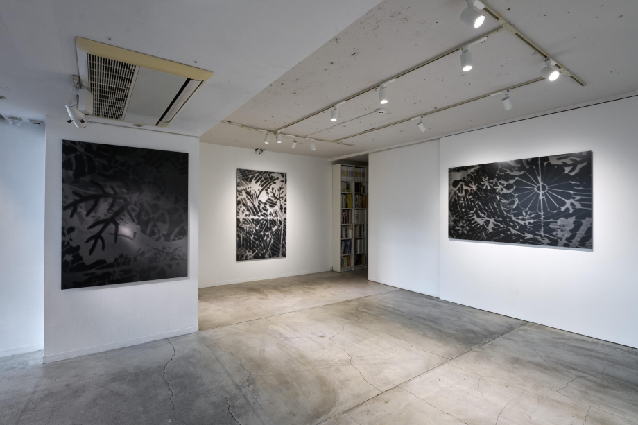印画紙に直接焼き付けるフォトグラムにおいては、影の部分は白っぽく、逆に、光が当たった部分は黒く焼き付けられる。つまり、ネガとポジの関係が逆転するため、大巻の揺らめくようなフォトグラムと現実のインスタレーションでは、光と影の見え方が逆になる。反転した光と影は、私たちの時代の恩寵でもあり重力でもある原子力の二面性を含め、あらゆる二元論の逆転の可能性を示唆している。