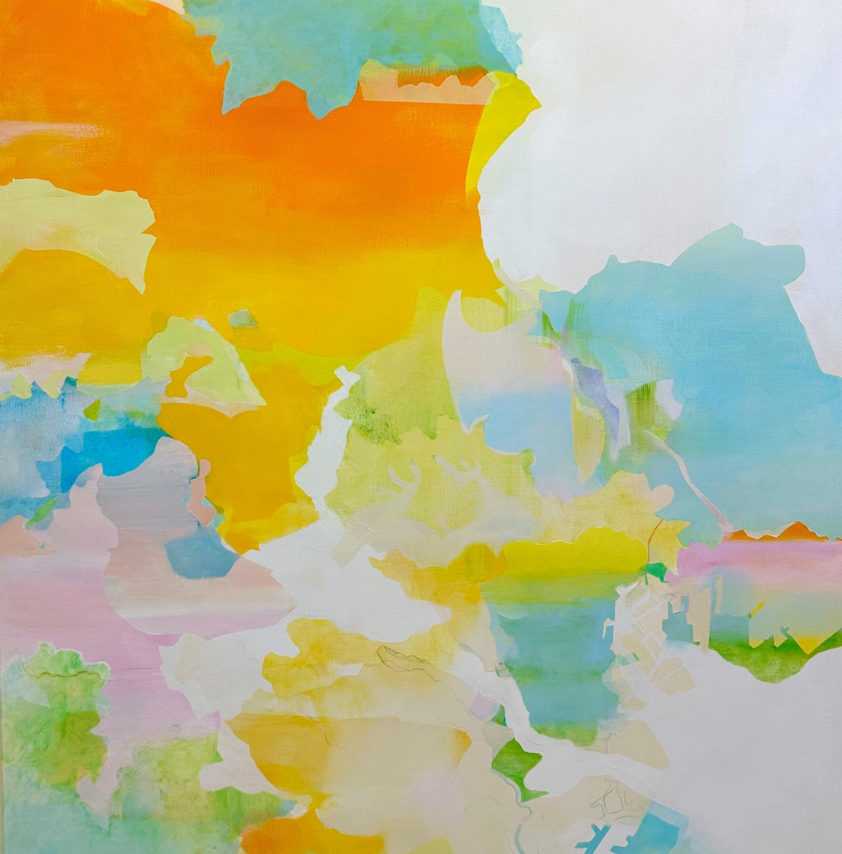 今回の油彩画は、東京の地図がモチーフになっています。主に流域地図、海水面が上昇し、内陸へ入り込む、東京湾の縄文海進に焦点をあてています。「東京」に内包された、海も川も巻き込むような東京湾の複雑なイメージが、山本独特の明るい色彩を纏って作品となりました。