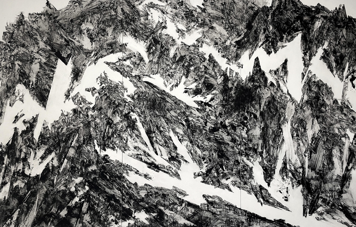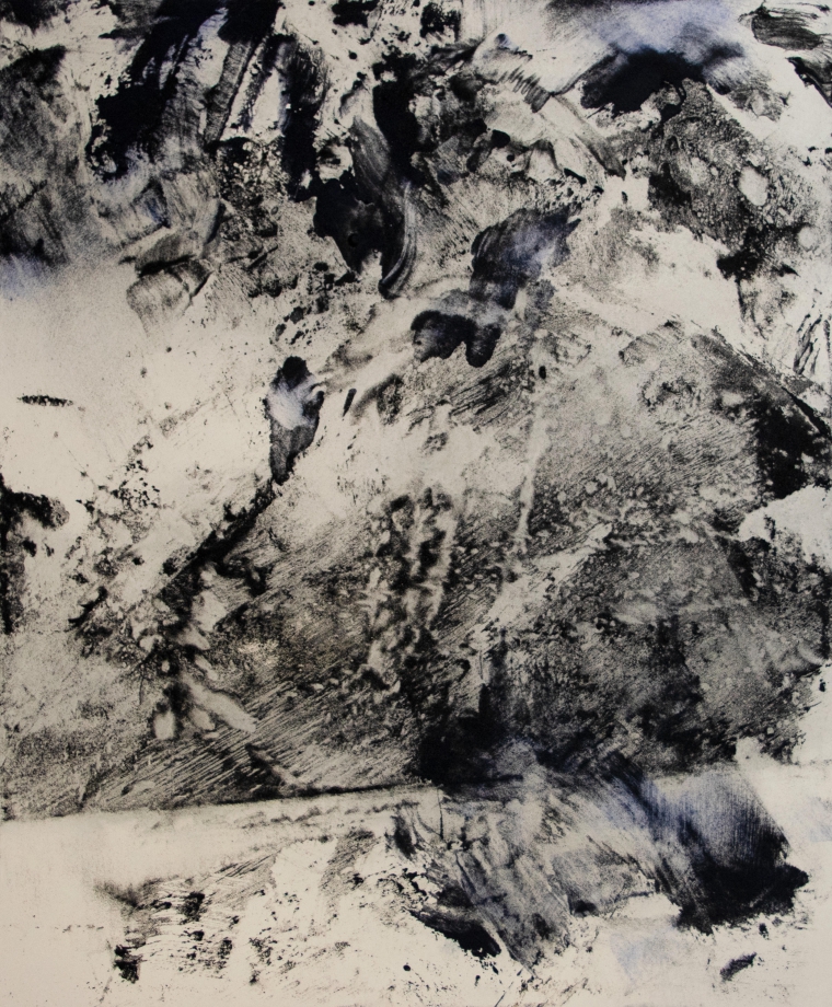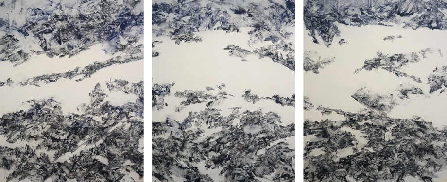 出品作の一つ《Levitating》には、水墨画の基本的な筆法である破墨や溌墨の技法が用いられ、刷毛跡が重なり合い濃淡を含みながら様々なイメージが生まれている。意図的に画面に下ろした刷毛が生み出すイメージの断片と自我や意図が排された刷毛跡が作り出す断片が混ざり合う。リトグラフによる表現を想起させるものなどもあり多彩だ。豊かな絵画空間が醸し出されている。こうしたイメージの断片の一つひとつは、自身の内にある感覚、体験、観念などを動員しながら山についての思索を繰返し、山に対する深く精神的なイメージを求めようとした結果と言えるものだろう。どの作品も時間をかけて見てみたい。