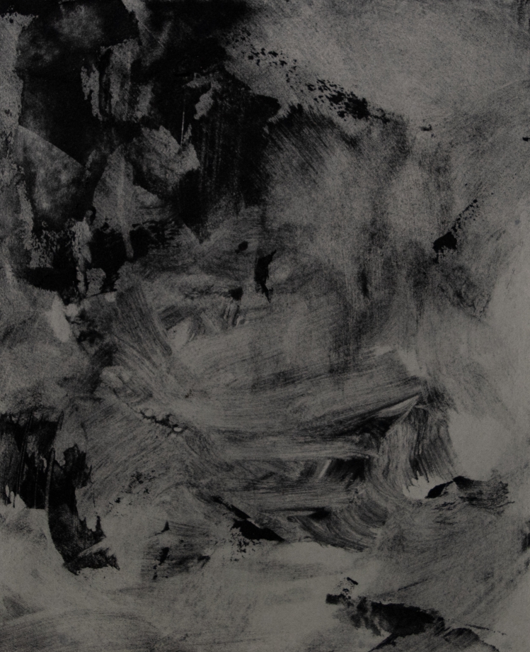 そう感じるのは、墨色の刷毛跡による混沌としたイメージの向こうに何かを見出したいという人間の本能によるのか、それとも記憶に仕舞われた景色をそこに投影したいという思いによるのだろうか。やがて、絵画が持つ豊かなイメージの広がりと想像の時が流れ始める。