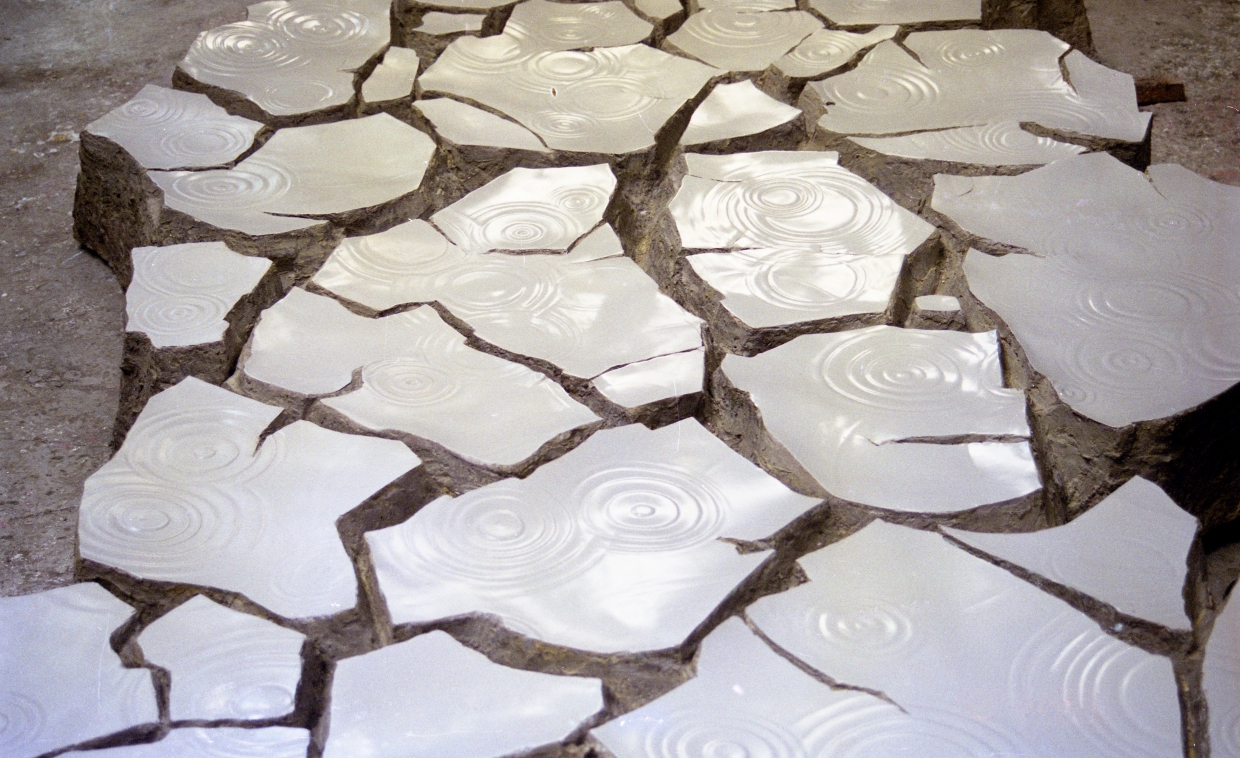 沈烈毅の作品では、湖面や雨など水にまつわる情景をテーマとしています。変幻自在な水の性質とは対照的に、それを表現する素材として彼は固い岩石や金属を使っています。その対峙する要素の融合、水滴が滴り落ちたまさにその一瞬を凍結させたかのような表現が彼の作品の特徴と言えます。
