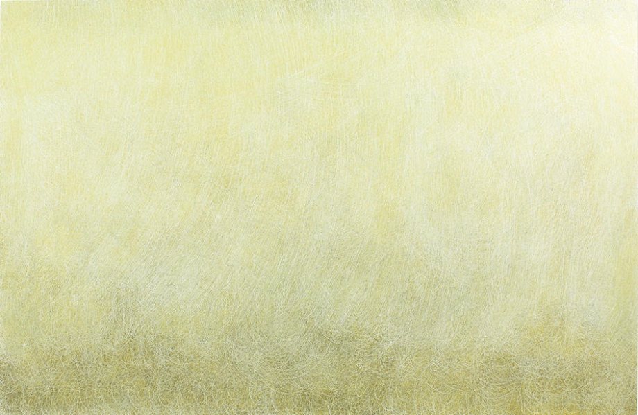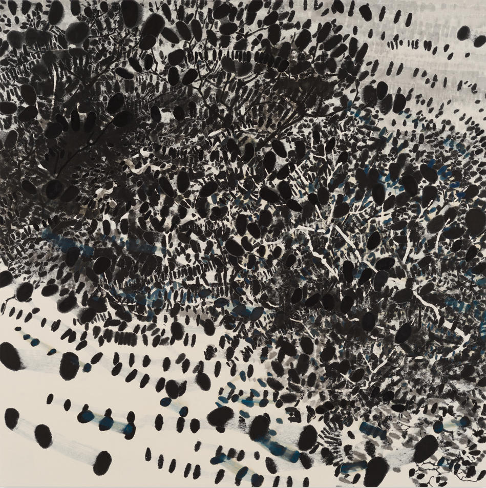 松や梅などの庭先の樹木が黒い墨のタッチで画面いっぱいに描かれている。和紙の裏側から大きな筆で一つ一つ楕円形の墨を置いてゆき、紙の表面ににじんだ痕跡が作品となるこの手法は、偶然をきっかけに生まれたものだという。以来10数年にわたり作家は入念な写生を基に何回となくこの手法を繰り返し、そのたびに少しずつ異なったテクスチュアを作り出してきた。屏風などの大画面も手掛け、現代の水墨画の一つの在り方と位置づけられて美術館に展示される機会も多いが、最近の作家は青色を中心とした色を加えてモノクロの世界から一歩踏み出すなど新たな挑戦を続けている。
