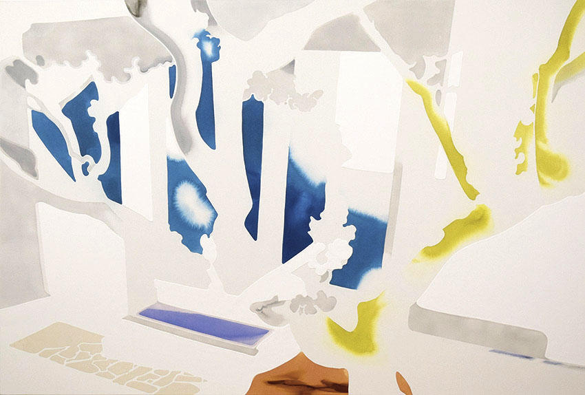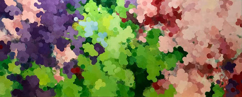 内海の絵画作品は、筆や綿棒を用いて点描のように精緻に描かれる。その色彩のハーモニーの美しさ、平面作品の枠組みを超えた深さと広がりが特徴的な作家である。内海は、四角い画面の中の絵画というより、空間の中にどのようにどのような作品を配置するかという点に強い関心を持ち、平面の作家の中ではある意味特異な姿勢を持って製作を続けている。見る側の動きや身体性との関係性から絵画を捉え、制作された作品群は、目の当たりにするとその色彩の世界へ引き込まれる様だ。
