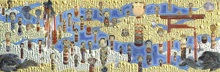 鴻崎の描くTOUGEN は古代中国の理想郷桃源に端を発し、ヒエロニムス・ボッシュや南蛮屏風、洛中洛外図を思わせる構図や金箔の使用が認められる。しかし近寄って細部を見ると、描かれているものは中世の異形や奇怪な動物、あるいは未来の乗り物や遺伝子の掛け合わせでできたような動植物であり、その有様は科学技術の行き過ぎた結果としての文明に警鐘をならしているようにも見える。また東北大震災によって郷里の福島県が被災した経験を受けて、東北芸工大の学生たちも交えて「東北画」は成立し得るのかという問にも真摯に向き合っているようだ。赤べこやこけしが近作の画面に散見されるのはその表れかもしれない。