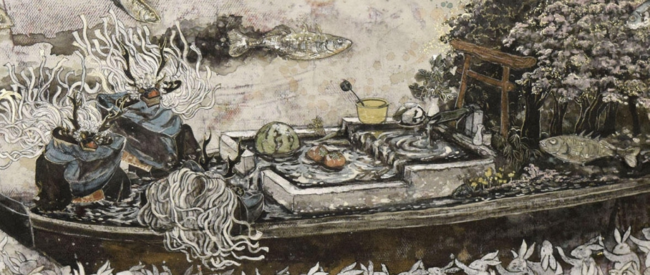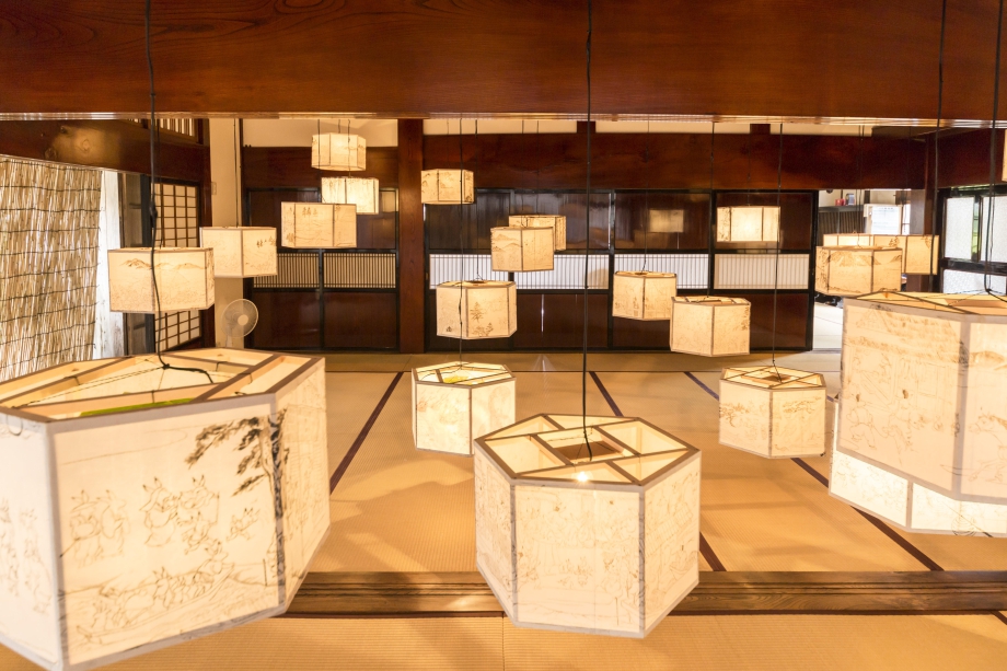 2015妻有作品(インスタレーション)撮影:中村脩田中さんは民俗学者の岸本先生の指導のもとで、「とびしまむかしがたり」という山形県酒田市飛鳥にまつわる民話を再収録し、小学生5年生向けに絵と解説を交えて紹介する絵本を制作しました。この作品の「倶利伽羅龍岩の奇話」はその中の一話です。舞台は飛鳥の西側にある小島、御酌島と呼ばれる女性禁制の聖地で、中はむきだしの岩肌が荒々しい洞窟になっています。洞窟の壁面は竜の鱗に例えられ、濡れて金色に光り輝き、その奥に御神体とされる観音様の岩陰があります。作品は、船の乗組員が御酌島の中に入り祈りをささげている場面ですが、その中の一人が美しい岩を盗み出してしまおうとしている場面だそうです。