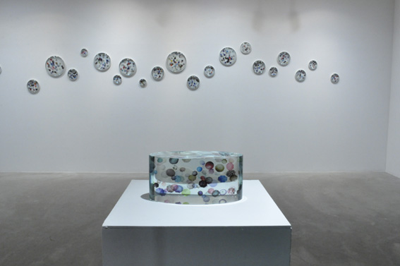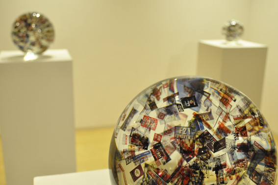 その後も何度か磯野の作品を見てきたが、新聞などから拾った言葉や人の写真をガラスに封じ込めた作品などイメージの選び方が非常に面白いのは作家の天性のセンスなのだろう。今回のアートフロントギャラリーでの展覧会のために磯野は大きな駅の周りを歩き、無数の看板を撮影している。駅ごとに分類していくつかのガラスの中に写真を閉じ込めたオブジェからは何が見て取れるのだろうか。渋谷駅、上野駅などそれぞれの駅によって集まる写真はどう異なるのであろう。あるいはどこへ行ってもチェーン店だらけになっていることを考えれば、渋谷も上野も大差はないのだろうか。一方、傘をテーマに制作した新作群でも作家は街に出て取材を重ねている。開かれた傘を上から撮影した写真が主体となっているが、開かれた傘から人の気配を充分感じさせる優れた作品である。集まったものを作品として再構築し、単なる資料展示のインスタレーションではなく確固たる作品として空間を仕上げる、そうしたこの作家の魅力が伝わる展覧会になると思う。