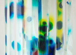 ところが、2013年になって竹中は突如35mmフイルムをギャラリーに持ち込み、その試作品を私たちの前に並べ始めた。私たちもこの作家がフイルム現像の仕事を以していたことを思いだし、この10年来の試行錯誤の結果、ようやくアートして結実した作品を初めて目の当たりにした。それはフイルムに恣意的に光を露光することで色を与え、それを複数の層として重ねることで見えないはずの光、あるいは光によって初めて見えるようになるはずの何かをフイルムという物体を通して可視化する作品群である。