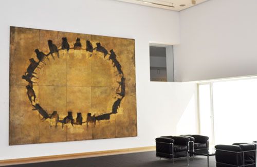 近年にはアメリカのフリーア美術館が所蔵する「雲竜図」(傳宗達)に取材し、伝統的な竜の図様を杉板・金箔・白亜・雁皮紙、ガスバーナーなどを用いてまったく別趣のものへと変化させています。具象でありながら、その圧倒的な物質感が抽象画にも通じる新たな境地を拓きつつあります。昨年から今年にかけて練馬区美術館にて大規模な個展が開かれ、今もっとも旬な作家の一人といえるでしょう。