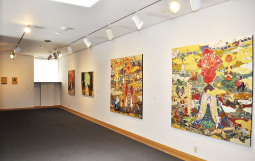 鴻崎正武(1972-)のテーマはTOUGEN、六朝の陶淵明の詩に由来する桃の花咲く仙人郷で、ここにヒエロニムス・ボッシュの絵から飛び出してきたような奇怪な人間や生物がパッチワークされ独特な世界をつくりだしています。伝統的な州浜や金雲や「かけあわせ」で造られた動植物を愛でるのもよし、画面から発せられる中世的なエネルギーに身をまかせるもよし、鴻崎の作品には様々な楽しみ方があるかと思います。最近チベット曼荼羅のコレクションで知られるアメリカの美術館に作品がはいったことからもわかるように、確かに国境、時空を越えて共通に理解されるメッセージを発信しているようです。