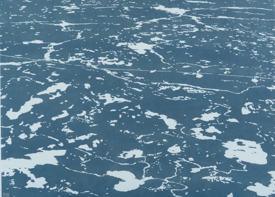 阪本が描くのは、都市や自然の景色、あるいはその一隅。木立や草むらの一つひとつの形態や重なり、それらが風で揺れる麗しい動き。渚のさざ波と、そこに反射する空から降る光のきらめき。ビルにはめ込まれたタイル壁や、空を分かつ送電線の抽象画のような連なりの優美さ。コンクリート舗装のひび割れから生え出た雑草の可憐。そうしたフレーム中の全ての場所に同等にピントが合っているので、どこへ向けて見たという視点は放置されているのに、それらの細部が空間や位置関係を失うほどに、デジタル・ハイヴィジョン映像の様にくっきりと目に入ってくる。