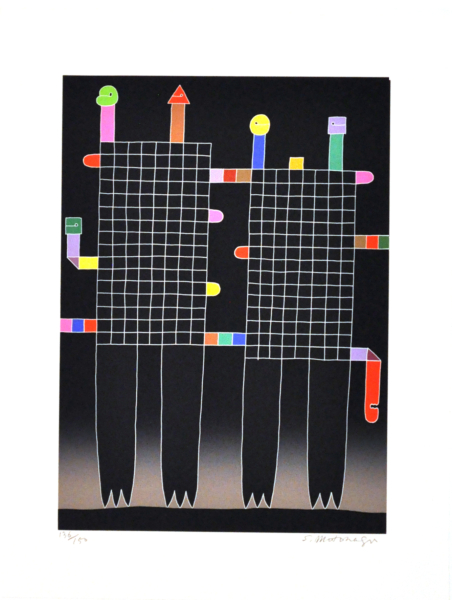 菅井汲 (1919-1996) は、グラフィックデザイナーとして活動する一方で日本画を中村貞以に学び、さらに欧米の美術にも深い関心を寄せて1952年に渡仏します。初期は文字や記号を抽象化した作品を制作しますが、1960年代以降、交通標識や車のスピード感にインスピレーションを得た、鮮烈な色彩と明確な輪郭線を持つ作風へと変化します。中原佑介は、基本の造形要素を決めて、その組み合わせから作品を作り出す菅井の作品を、モンドリアンと同列に語り「機械的手段による絵画」と評価しました。また近年、 中原が館長を務めていた兵庫県立美術館にて、「館長菅井汲を語る」(2007年)と題した講演会を行っています。