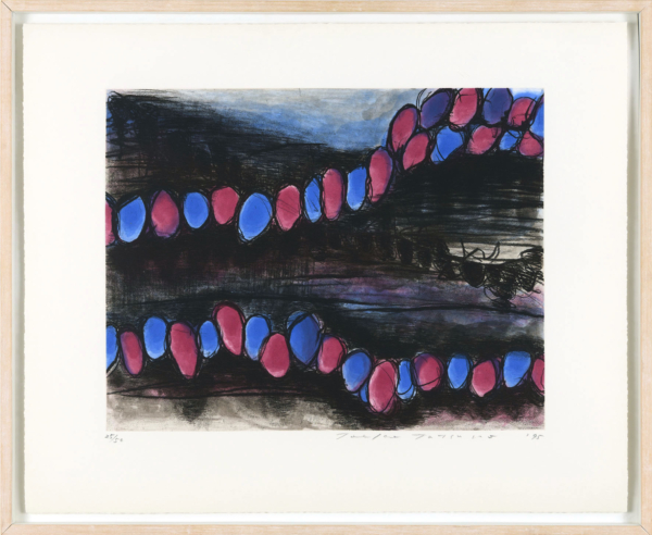 辰野登恵子 (1950-2014) は、1970年代の「ポスト・ミニマリズム」の動向などに根ざして、線描の強弱や僅かなにじみにより生まれる差異の形象化を、版画やドローイングなどを通して試行し、1973年に中原佑介がコミッショナーを務めた東京ビエンナーレに参加します。1980年代以降は、絵画を中心に、アラベスク、ダイヤ、方形、球など植物的かつ幾何学的な多種多様なモチーフの連続的なパターンと、油絵具の質感を生かした色彩表現を行いました。1995年には史上最年少(当時)で東京国立近代美術館での個展を開催しています。