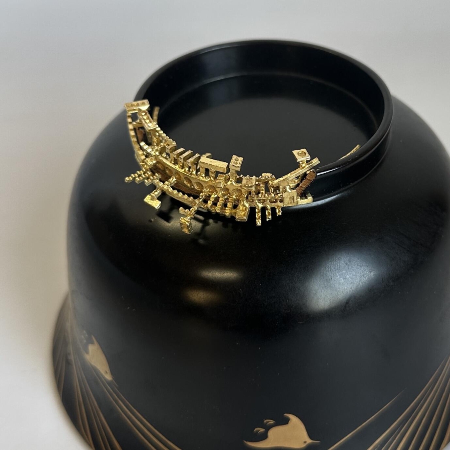 竹中美幸《影》久野彩子は細密鋳造という工芸の技術を用い都市風景を想起させる彫刻を作る作家です。普段は、小さな彫刻作品や、ジュエリーなどをその主戦場としてきましたが、奥能登への参加を機会に既存のファウンドオブジェクトとの融合を試み空間的な表現が可能となりました。今回は奥能登で見つけた壊れた古道具の欠けた部分を、持ち主の記憶を大切にしながら細かな金属で再生していきます。