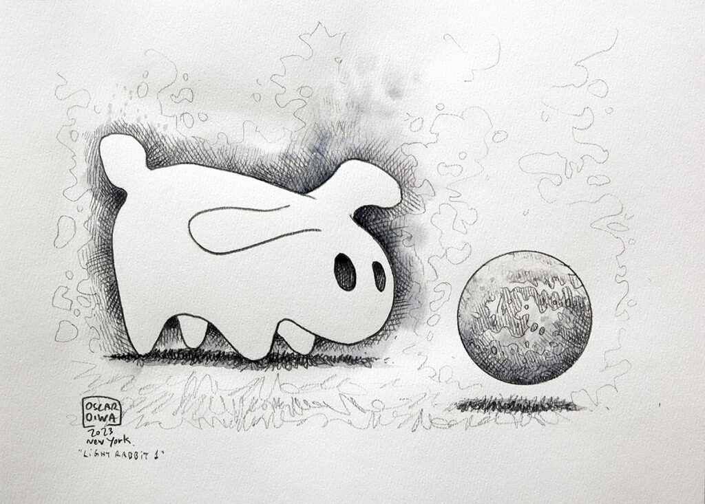 大岩 油彩画のタブローを8点、隔離生活シリーズの版画を4点、新作は《シャドウキャット》と《ライトラビット》のドローイングを4点持って行く予定です。新作ドローイングのキャットは影、ウサギが光を表していて、光と闇のシンボルとしていつも描いているモチーフです。