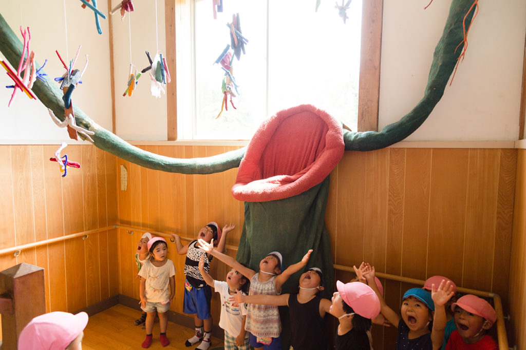 2000年に始まった「大地の芸術祭 越後妻有アートトリエンナーレ」。今夏、第8回を迎える3年大祭は、すべてが子どもたちに捧げられていると言っても過言ではないでしょう。アートを道しるべに里山をめぐり、地域の人や生活と出会い、滋味豊かな食を味わい、世界のアーティストの作品を通して多様な世界観を知る。「鉢&田島征三 絵本と木の実の美術館」をはじめ、子どもたちの心に響く作品やイベントは枚挙に暇がありません。2006年にスタートした「越後妻有こどもサマーキャンプ」は越後妻有でのそうした体験を凝縮したプログラムでした。廃校をリノベーションした三省ハウスに宿泊し、地元のお母さん方による食を味わいながら、里山科学館キョロロで自然探検をし、アーティストによるワークショップ、アートツアーを体験する。サマーキャンプを“卒業”した子どもたちは前回の芸術祭では「こへび隊」にも参加しました。2011年、東日本大震災の年からは「越後妻有の林間学校」にヴァージョンアップし、被災地の多くの子どもたちを受け入れました。現在、「大地の芸術祭の里」は、年間を通じて修学旅行も含め、子どもたちの学びと体験の場となっています。