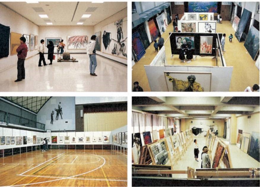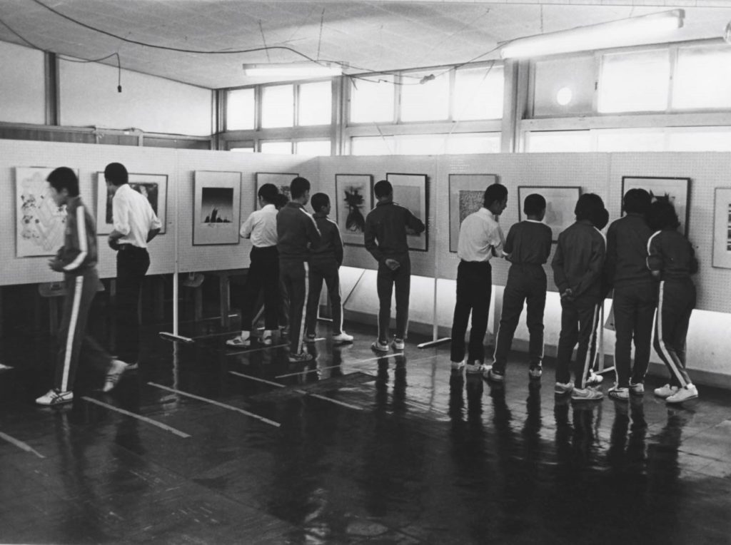 恩地孝四郎、長谷川潔から、関根伸夫、野田哲也まで、日本の近代美術・現代美術を代表する40人の作家による版画作品40点を小・中・高校の教室や廊下、体育館など子どもたちの日常の場に展示し、会場校から次の会場校へ先生方がリレー方式で運搬しました。いろいろな技法による版画表現の多様さ、たくさん刷れるという版画の複数性を活かしたこの移動展覧会は、各地の学校、教育委員会や文化団体との協働によって実現、それぞれの地で大きな反響を呼びました。「子どものための版画展」は現在も作品をアップデートし、随時、貸し出しを行っています。